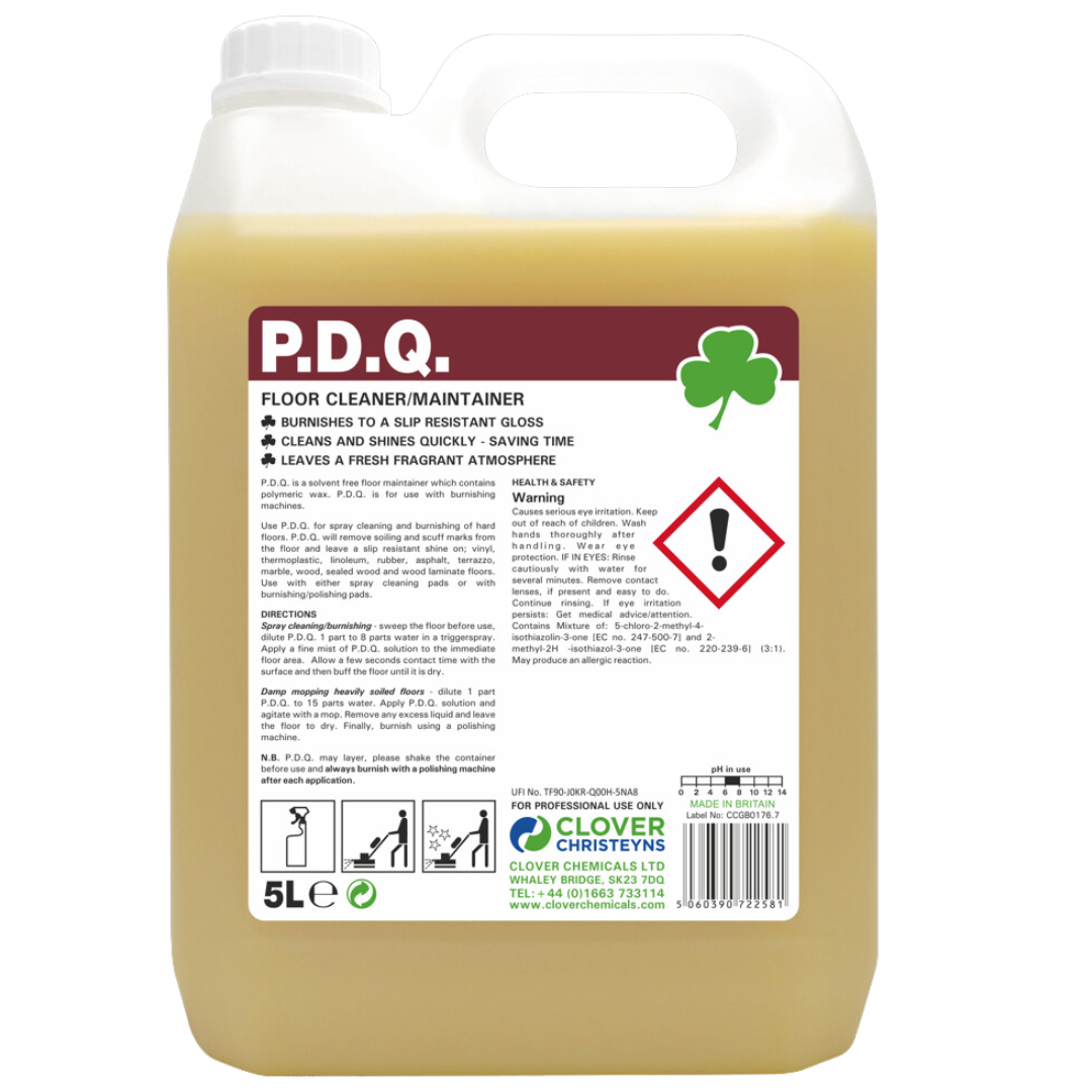Removes soiling and scuff marks from the floor. P.D.Q. should always be used with a burnishing machine. Produces a slip - resistant shine.