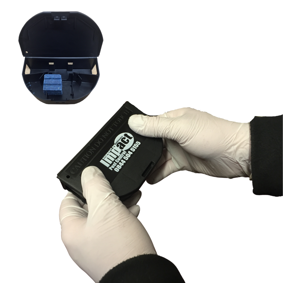 Disposable, pre-baited, sealed mouse bait station. Each bait station contains a blend of wheat flour, chopped wheat and 50ppm of the second generation anticoagulant difenacoum bound together with edible waxes. This blend also contains a blue indicator dye, 10ppm of denatonium benzoate to deter consumption by children and a chocolate attractant that rats and mice find irresistible. No handling of poison required.